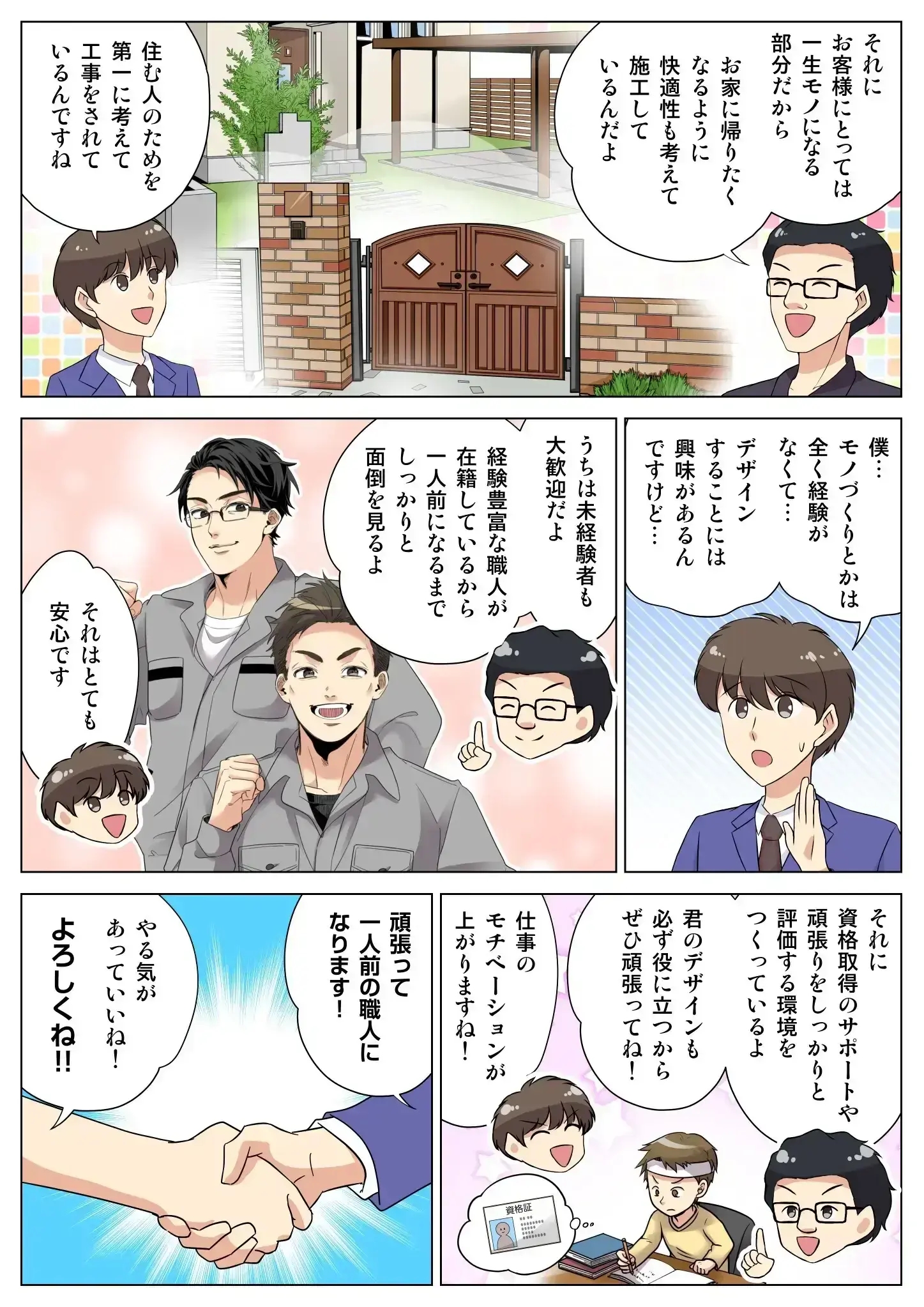 弊社には経験豊富な職人が在籍しており、高い知識やスキルを間近で学べます。ただ見聞きするだけでなく、ご自身のスキルアップとして取り入れていくことで、確実に成長していくことが可能。あなたのやる気が、一流の職人への道を切り拓いてくれます。